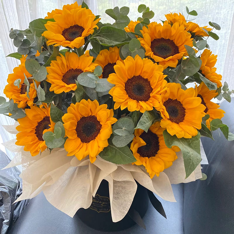 花材: 19朵精品向日葵,搭配尤加利叶等绿叶装饰。