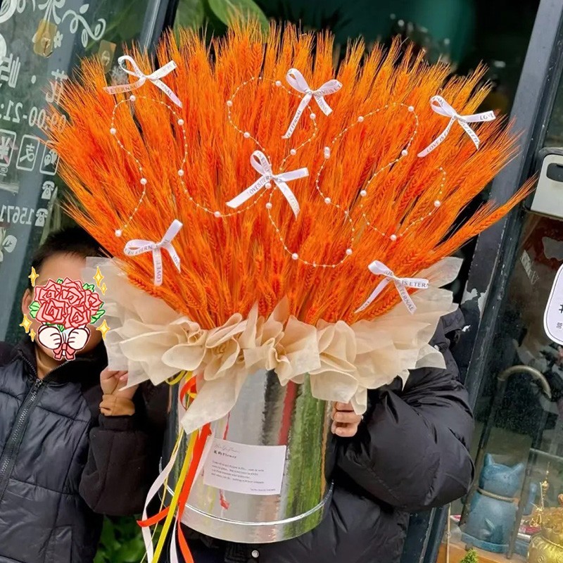 花材: 500支大麦,1条珠链,6支缎带蝴蝶结装饰表面。香槟色软纸内衬,抱抱桶(款式随机)包装,多色彩带花结。
