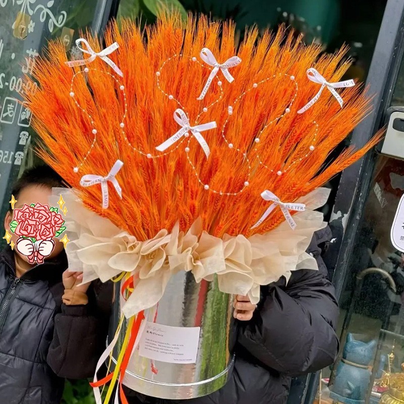 花 材:500支大麦,1条珠链,6支缎带蝴蝶结装饰表面。香槟色软纸内衬,抱抱桶(款式随机)包装,多色彩带花结。