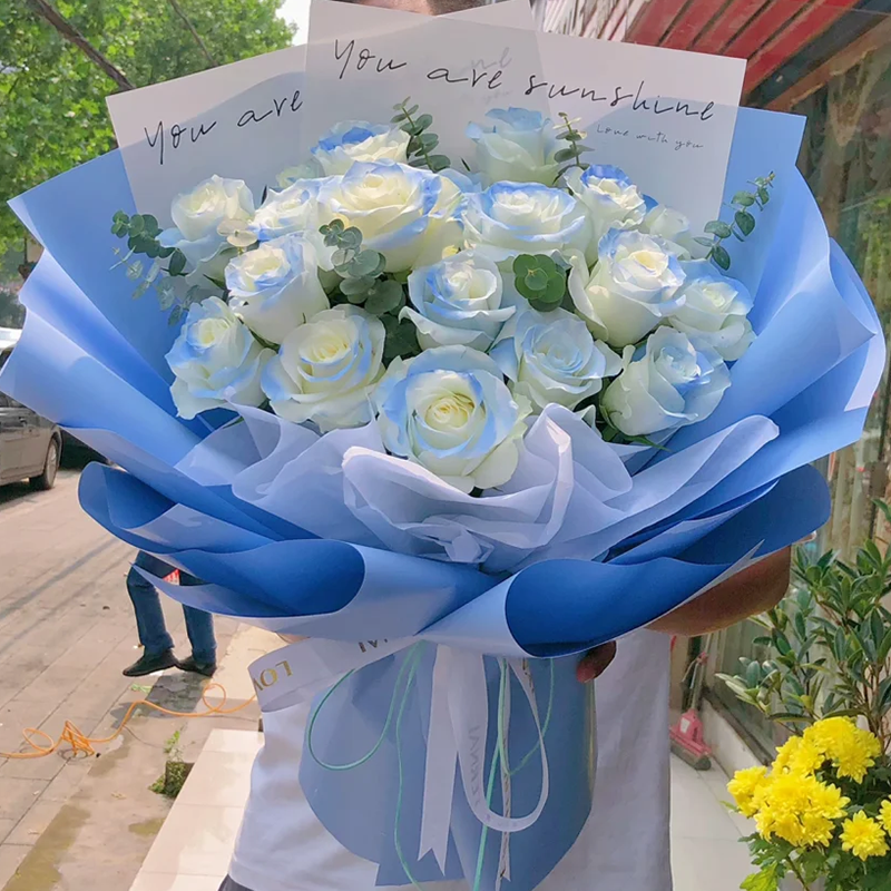 【浪漫之歌】19朵碎冰蓝玫瑰,尤加利叶间插装饰。