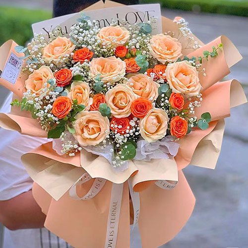 【一路有你】11支精品香槟玫瑰,搭配6支橙色多头小玫瑰,满天星,尤加利叶装饰。