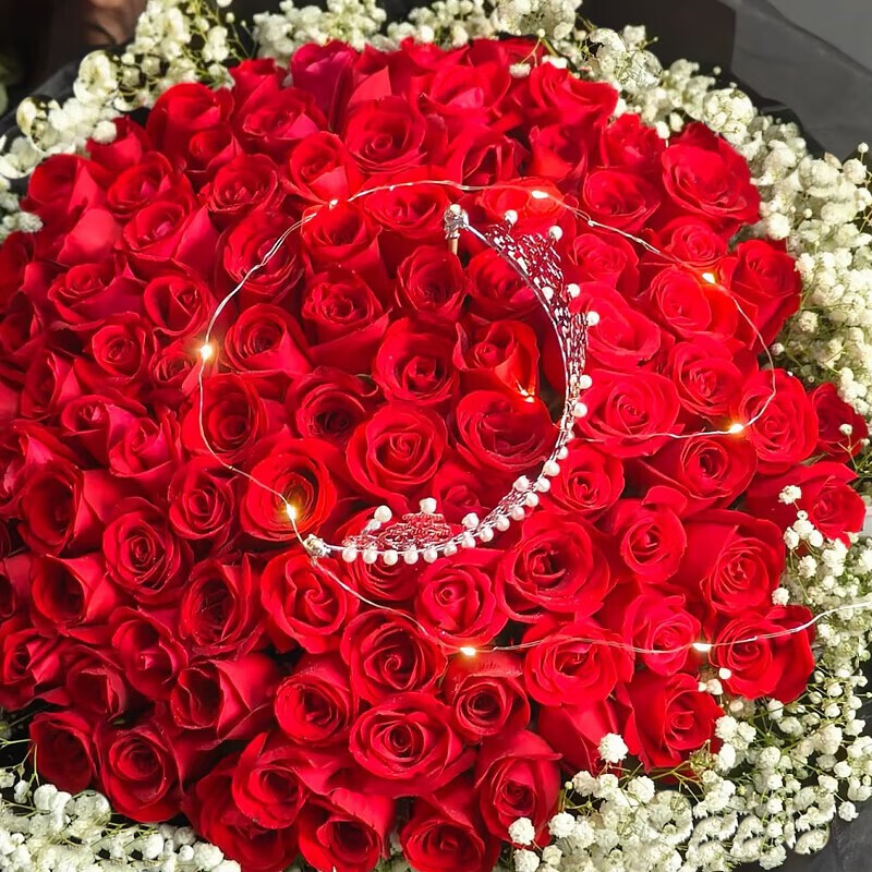 花 材:99支顶级红玫瑰,搭配皇冠、灯带装饰,满天星环绕。