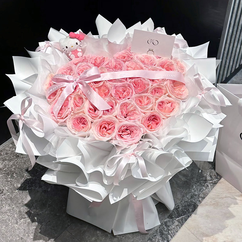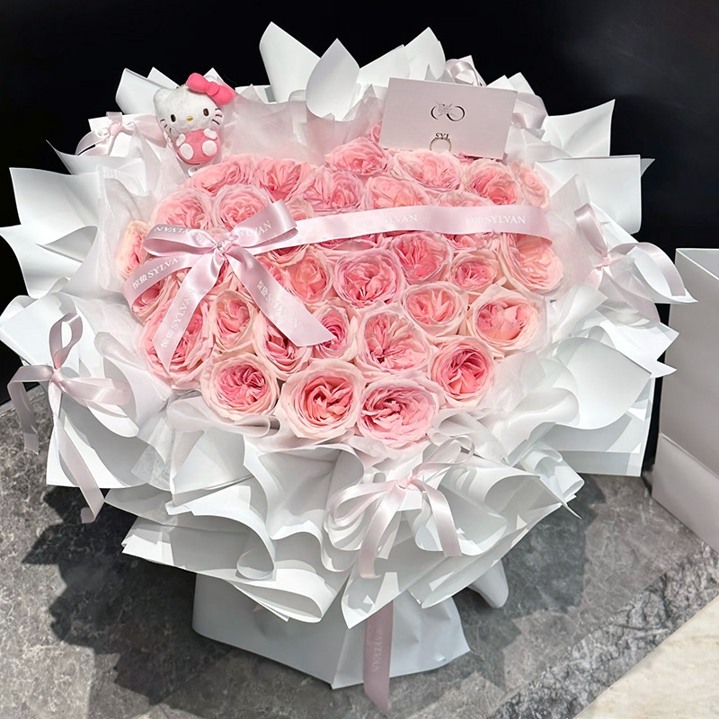 花 材:精选33朵粉荔枝玫瑰,心形造型,1只kitty猫(款式随机),表面粉色丝带蝴蝶结装饰。