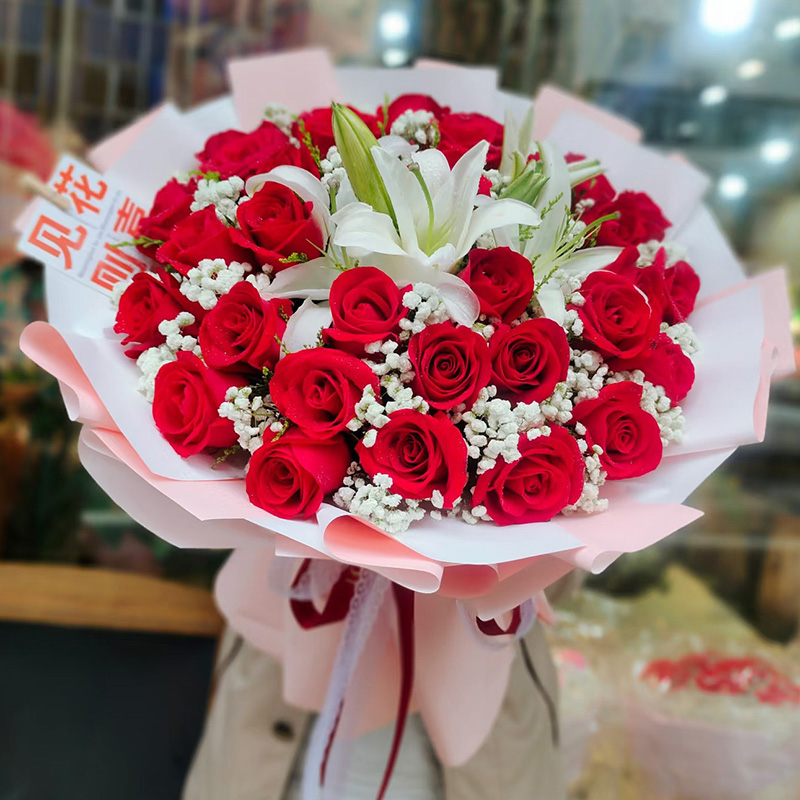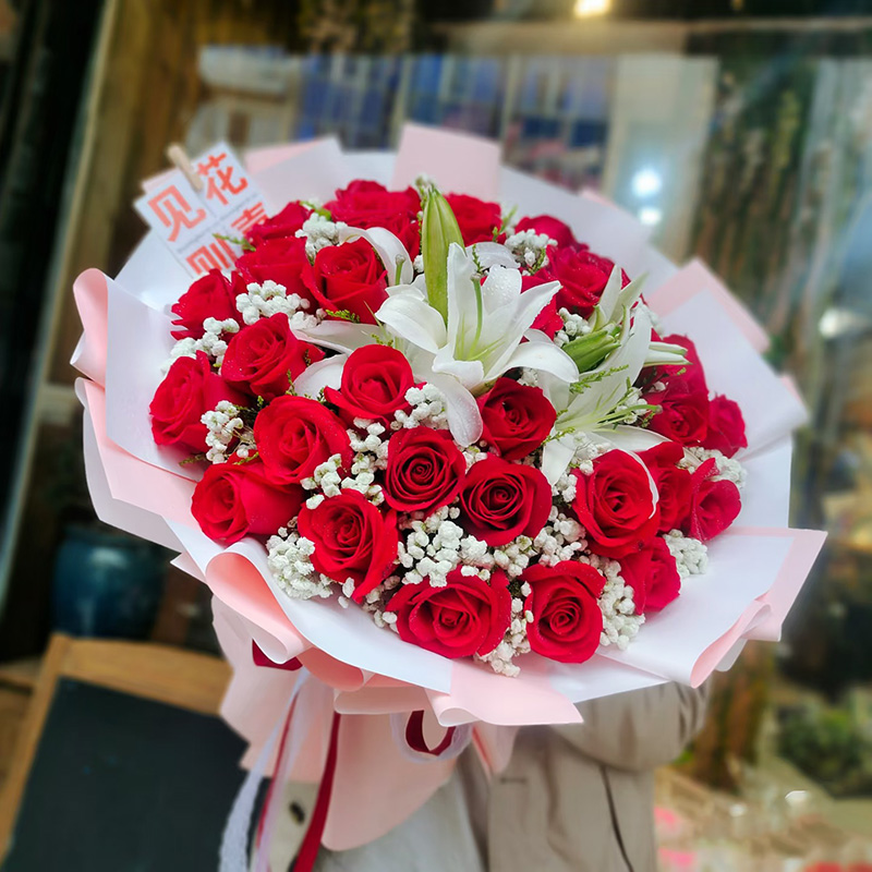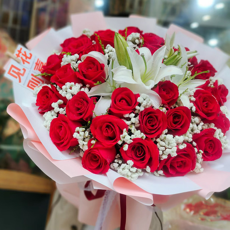 花材: 33朵精品红玫瑰,2支多头白色香水百合,搭配白色满天星丰满间插。