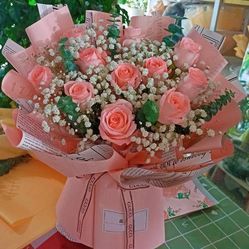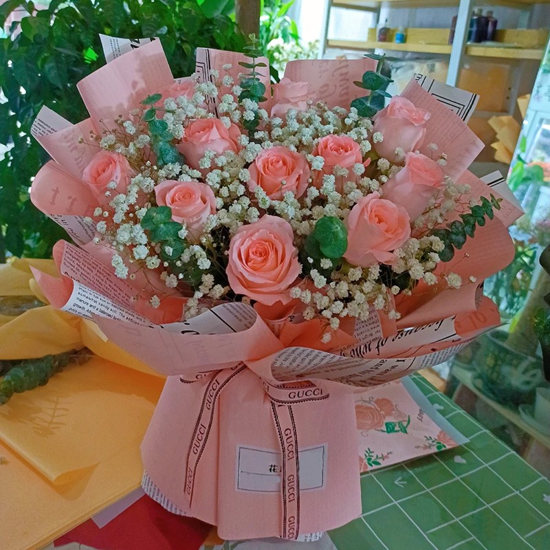 花 材:11枝粉玫瑰,搭配白色满天星、尤加利叶丰满间插。
