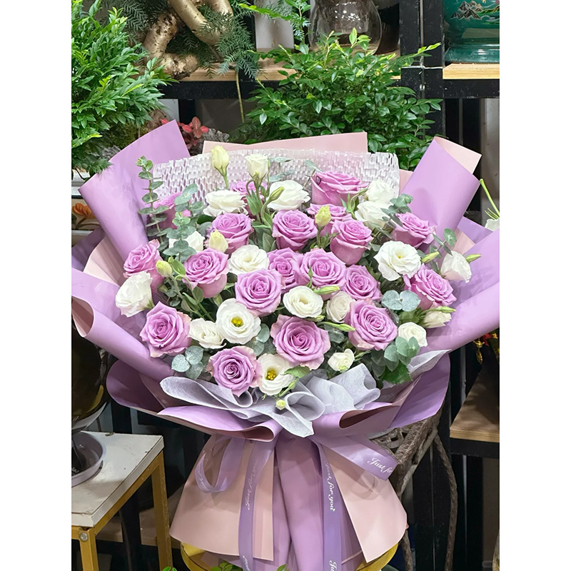 花材: 精选19朵紫霞仙子紫玫瑰,6支多头浅色洋桔梗,搭配尤加利叶装饰。