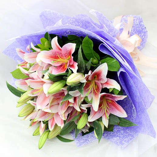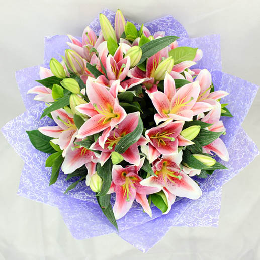 花 材:8枝粉色多头西伯香水百合,搭配绿色新鲜叶材。