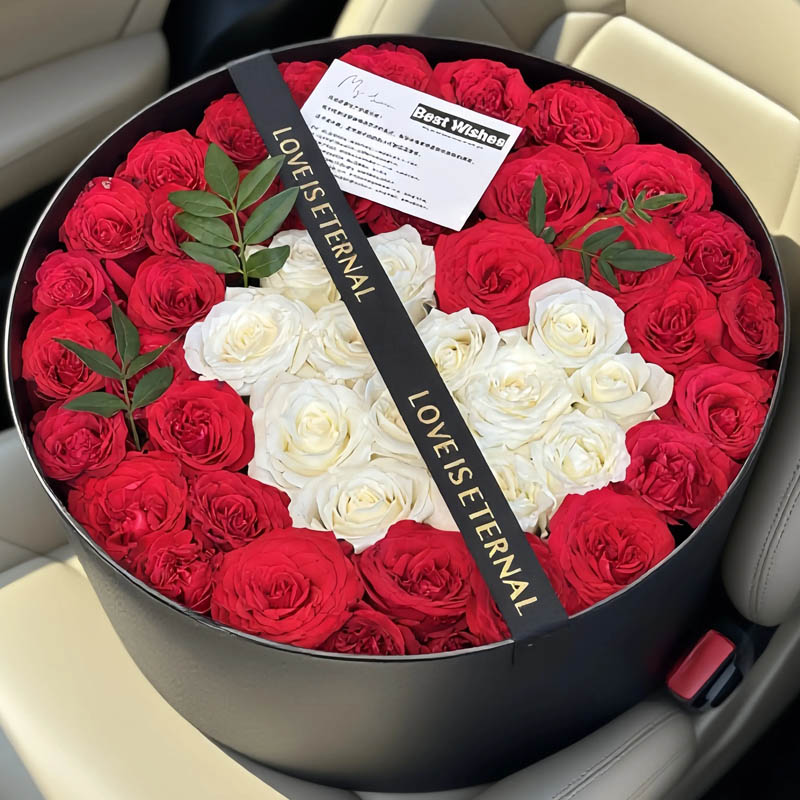 花 材:52朵玫瑰混搭(13朵白玫瑰心形造型,39朵红玫瑰外围环绕),尤加利叶,黑色金字缎带装饰花面。