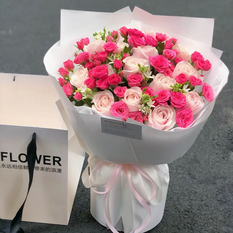 包装: 白色雪梨纸内衬,白色韩素纸外包,粉色/白色花结。