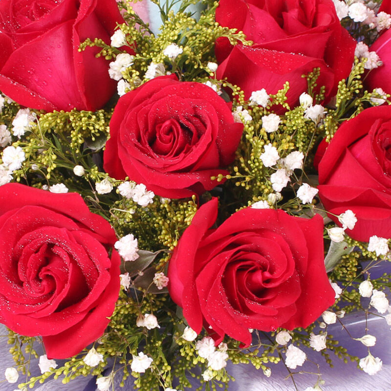 花 材:11支红玫瑰,满天星、黄莺间插,随机赠送两只可爱的小公仔。