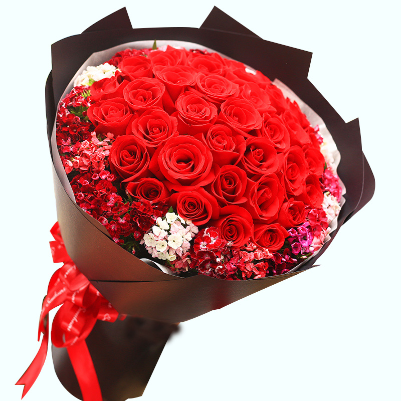 花 材:33支精品红玫瑰,外围搭配适量红色、粉色、白色石竹梅。