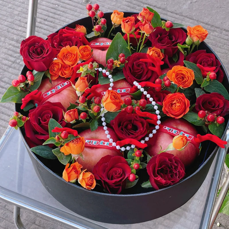 花 材:11枝红玫瑰,1条珠串,5个苹果(每个苹果用红色系丝带缠绕装饰),5枝多头橙色泡泡,红豆、尤加利叶丰满间插。