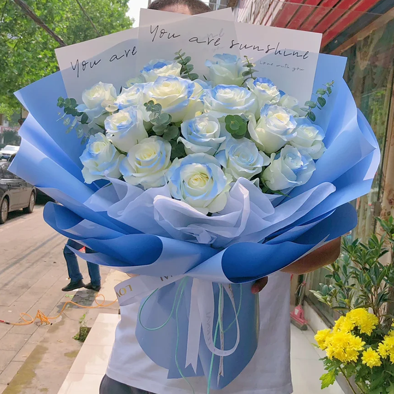 - 花材19朵碎冰蓝玫瑰,尤加利叶间插装饰。