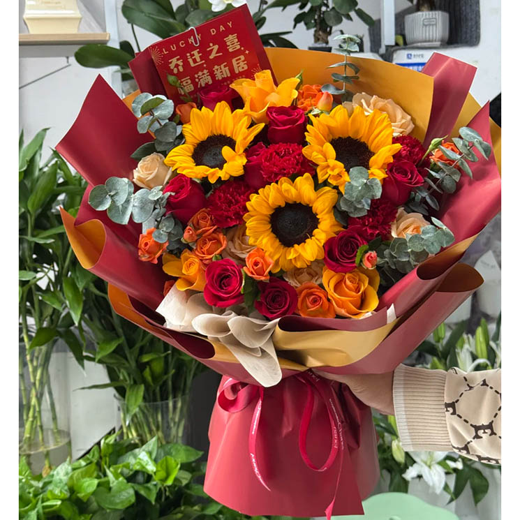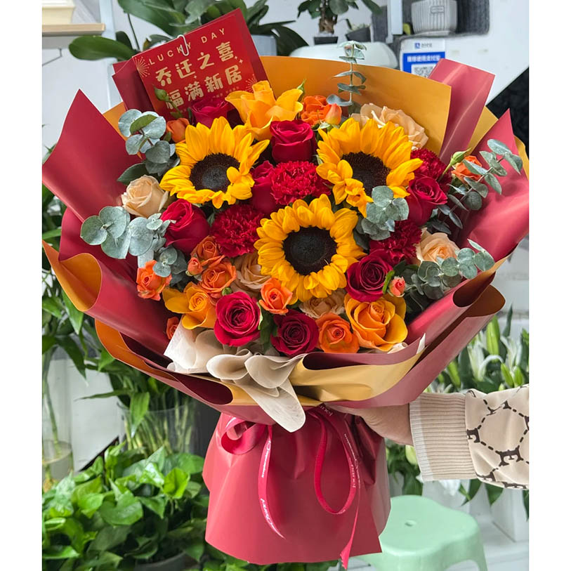 - 金辉满载 - 精选3枝向日葵,19朵玫瑰康乃馨混搭(红玫瑰和红色康乃馨为主,金辉玫瑰、香槟玫瑰),5枝多头橙色泡泡,搭配尤加利叶装饰。