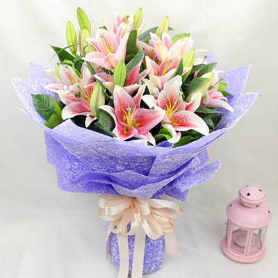 - 持久的爱 - 33朵粉玫瑰,1条灯带,1个白色缎带蝴蝶结装饰花面,洋甘菊间插(若洋甘菊断货,则用白色满天星或者洋桔梗代替)。