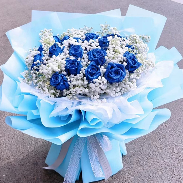 - 花材精选19朵蓝色妖姬,1条彩灯,白色满天星丰满间插。
