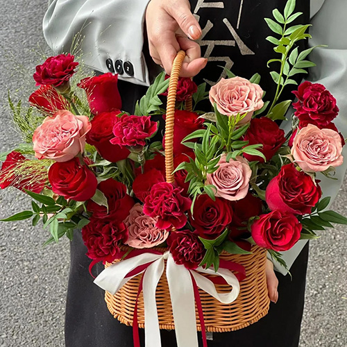 - 花材11朵精品红玫瑰,一对小熊,搭配相思梅、黄莺。