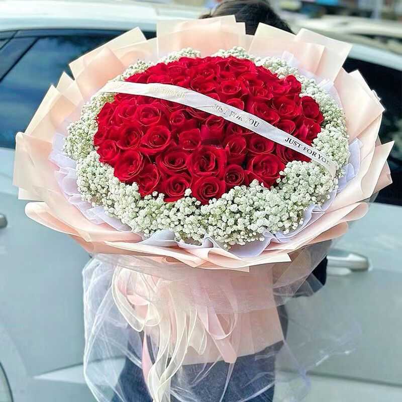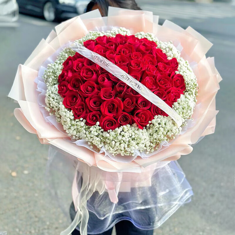 - 花材精选52朵红玫瑰,白色满天星外围环绕,白色英文缎带装饰花面。