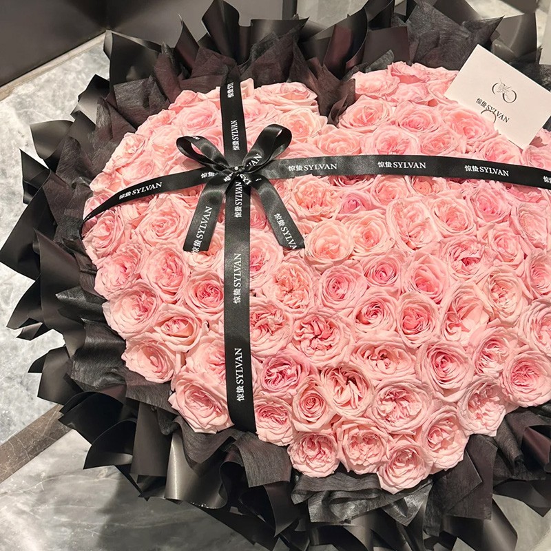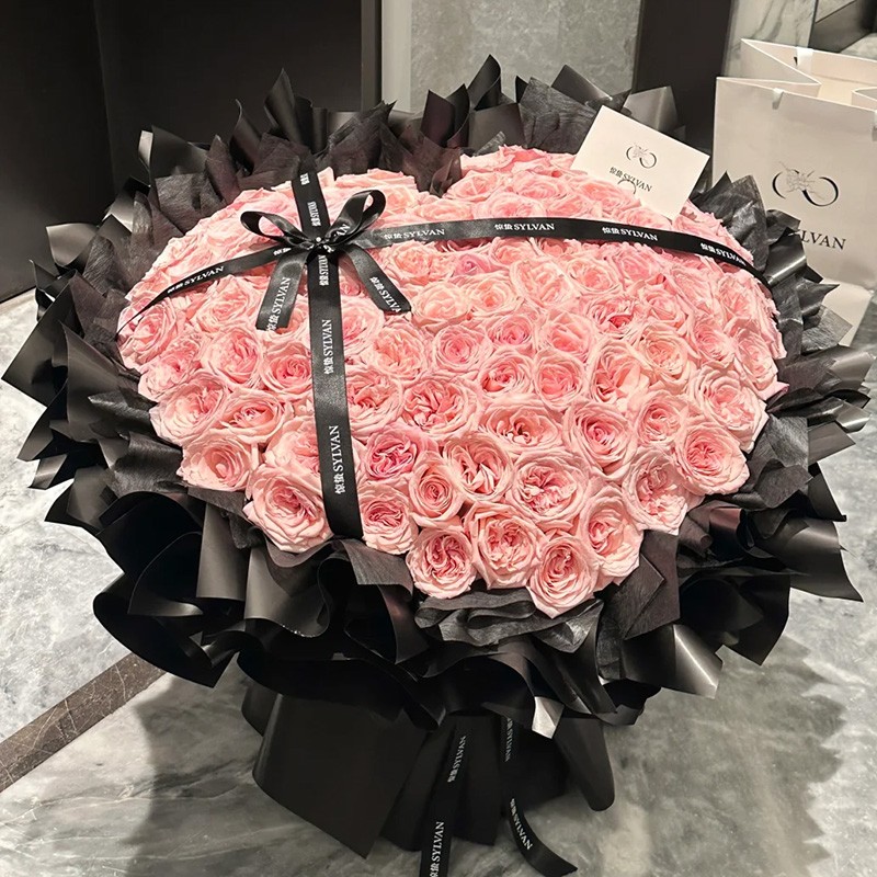 - 花材精选99枝粉荔枝玫瑰,黑色缎带装饰花面。