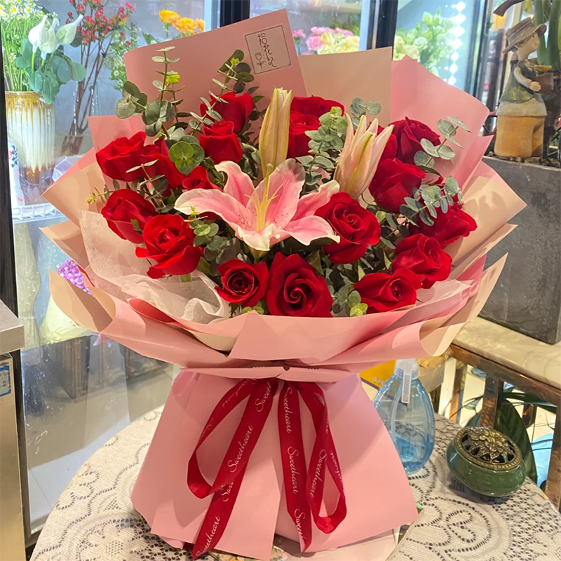 - 花材19枝卡罗拉红玫瑰,1枝多头粉百合,搭配尤加利叶装饰。