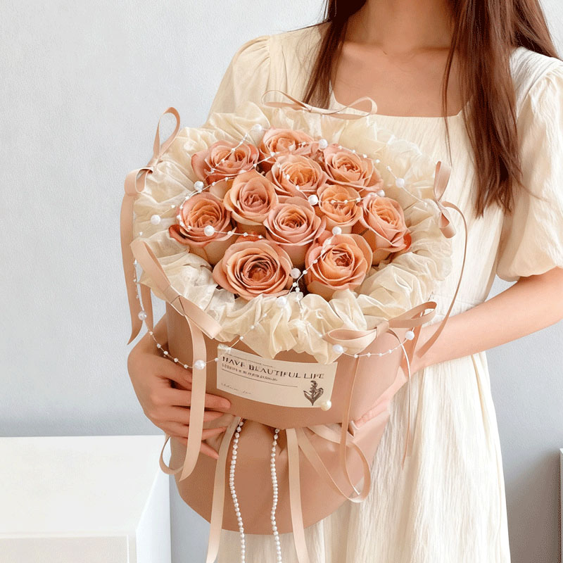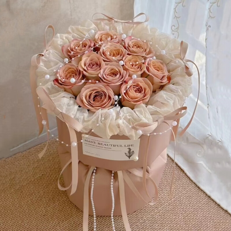 - 花材精选11枝卡布奇诺玫瑰,珠串装饰花面花体,5支同色系蝴蝶结围绕包装装饰,白色纸内衬,同色系小香风包装,珠串和同色系缎带花结。