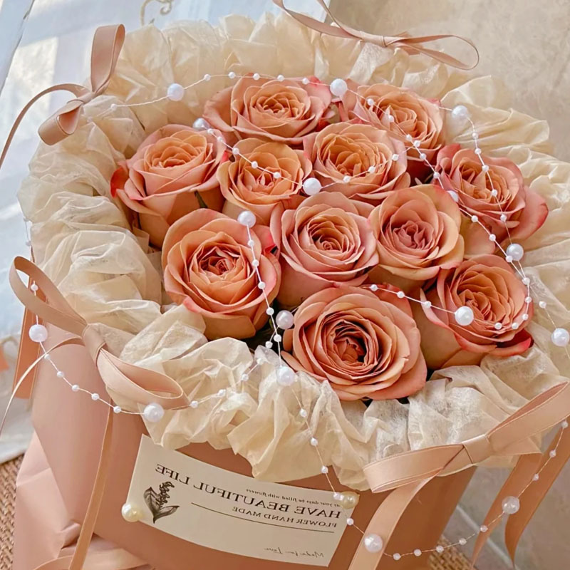 - 满眼星河 - 精选11枝卡布奇诺玫瑰,珠串装饰花面花体,5支同色系蝴蝶结围绕包装装饰,白色纸内衬,同色系小香风包装,珠串和同色系缎带花结。