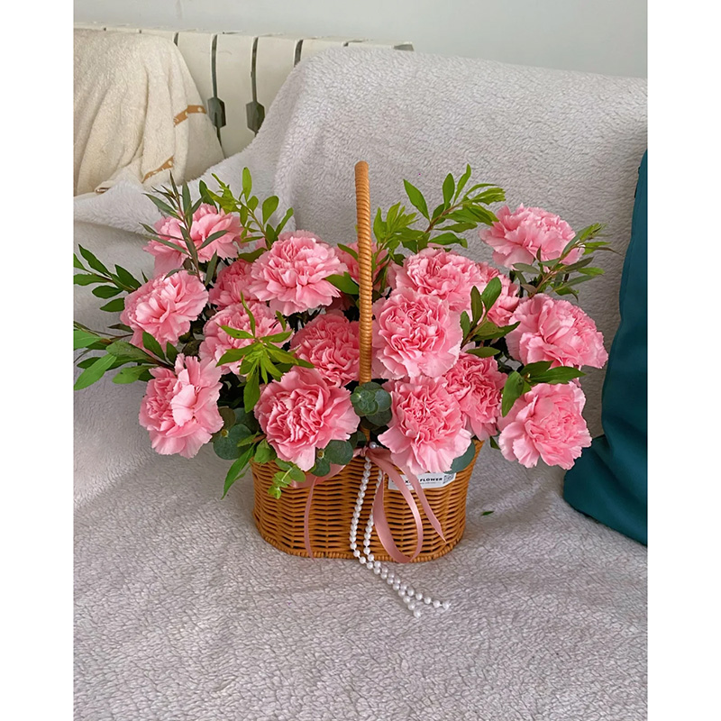 - 花材精选19朵粉色康乃馨,搭配九星叶、细叶尤加利叶装饰。