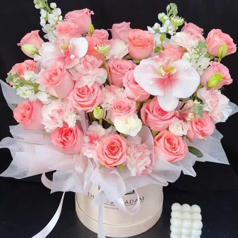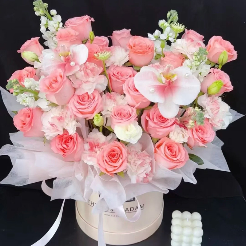 - 盈盈满怀 - 26枝戴安娜粉玫瑰,6枝粉色康乃馨,2朵白色蝴蝶兰(喷粉色),4枝白色紫罗兰,4支多头洋桔梗,尤加利叶装饰。