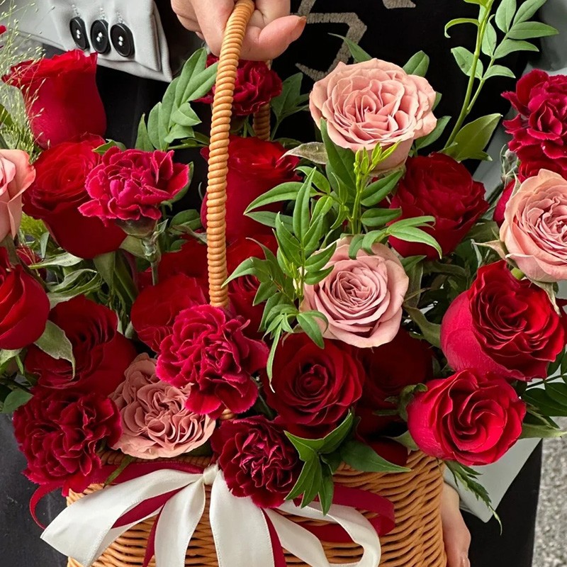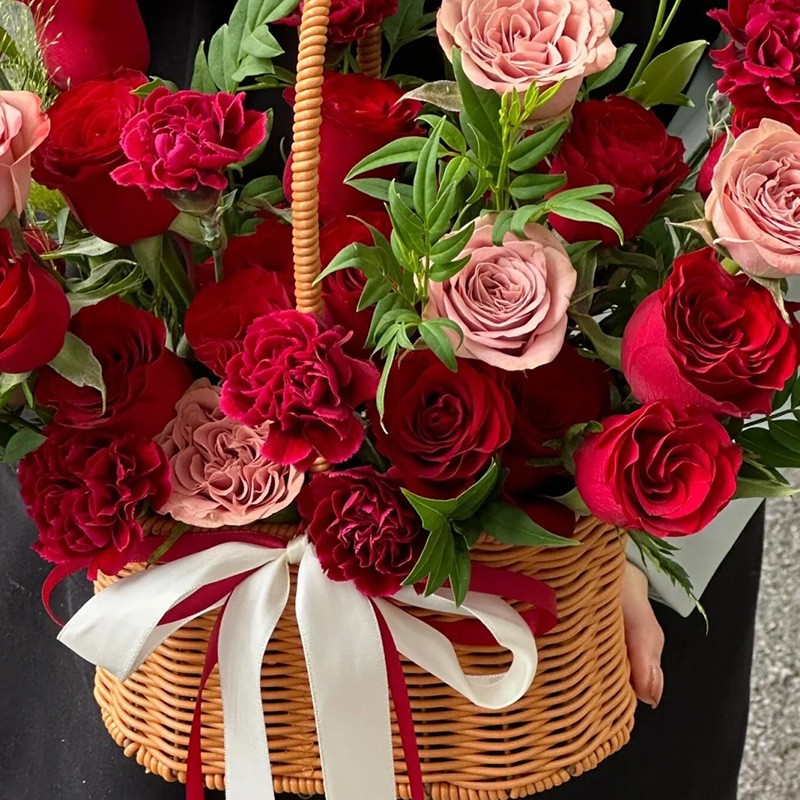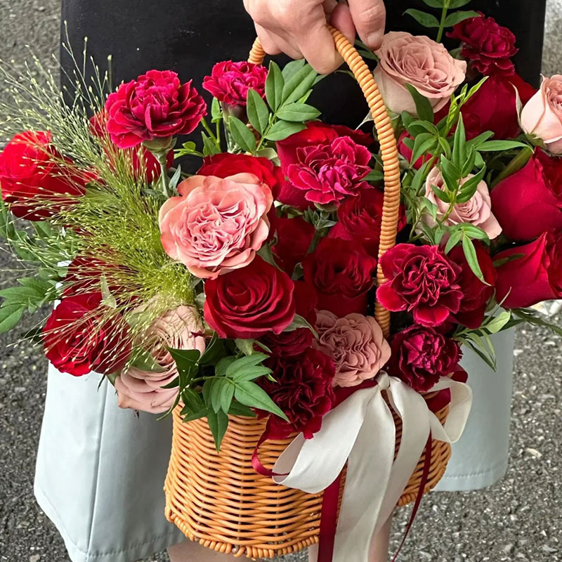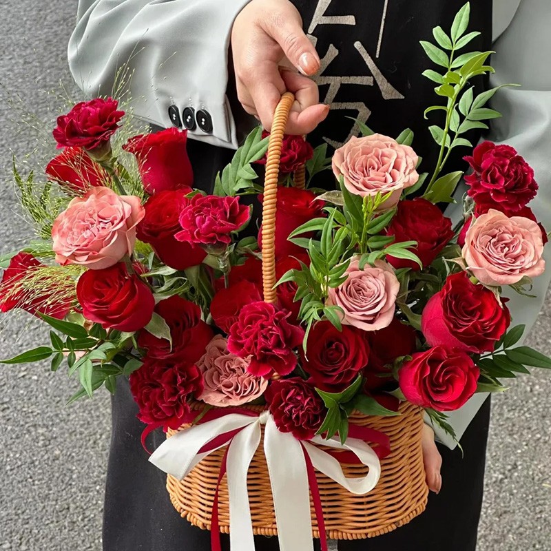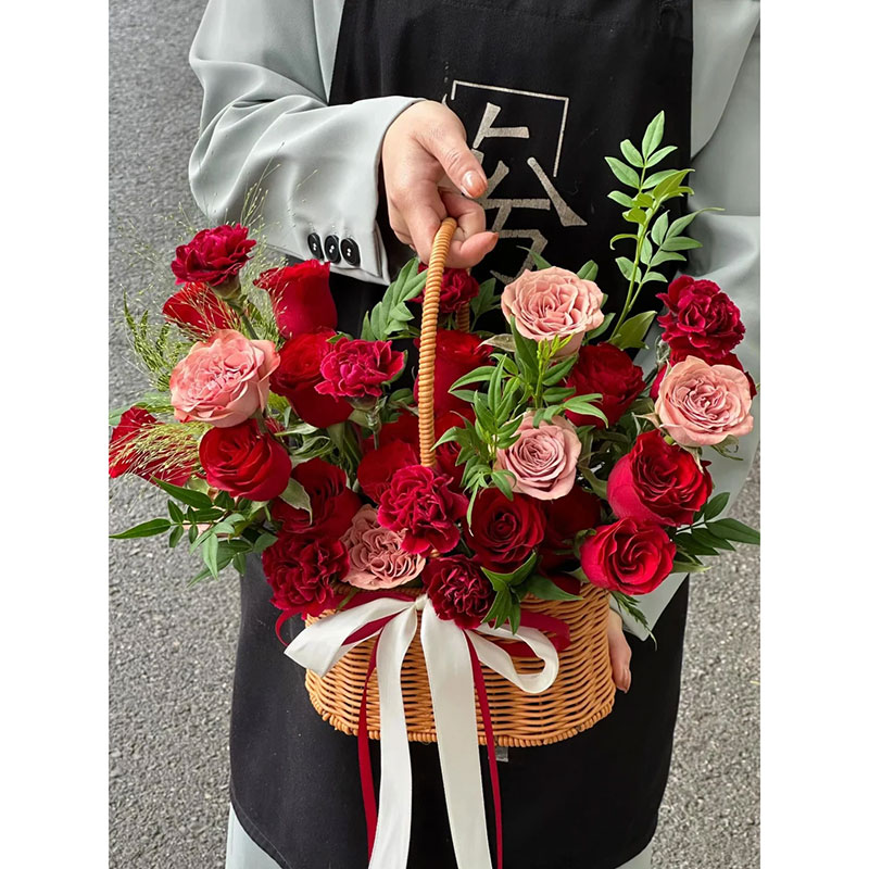 - 商品包装精美手提花篮,提手处用红色、香槟色丝带系蝴蝶结装饰。(篮子和配饰等具体以当地实物为准)