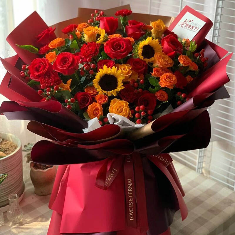 - 花材精选3朵向日葵,19朵红色玫瑰与红色康乃馨混搭,5支多头橙色泡泡,搭配红豆、尤加利叶装饰。