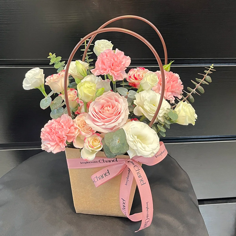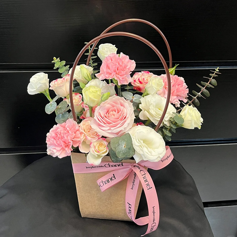 - 商品包装精美纸质手提花篮,粉色丝带系蝴蝶结装饰(篮子和配饰等具体以当地实物为准)。