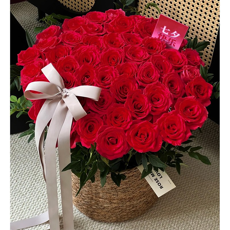 - 花材精选52朵卡罗拉红玫瑰,搭配九星叶、尤加利叶,表面浅色蝴蝶结缎带装饰。