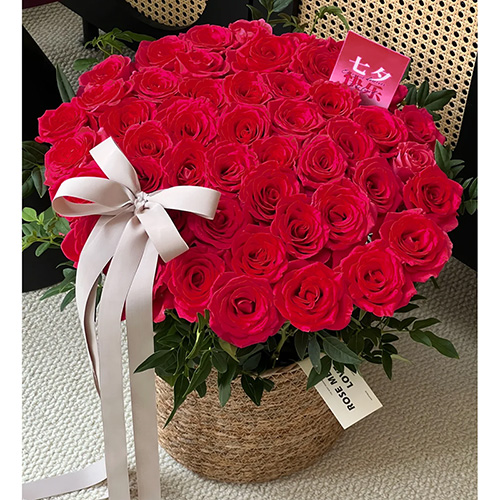 - 十里红妆 - 99朵红玫瑰,白色缎带系蝴蝶结装饰花面。