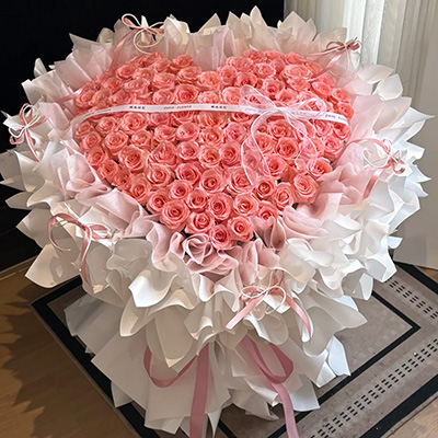 - 花材99朵精品粉玫瑰,1条珠串装饰花面。