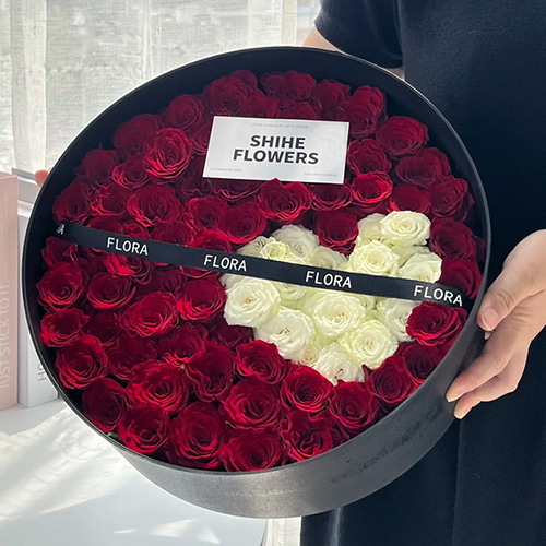 - 花材52支精品红玫瑰,满天星环绕,心形造型,精美皇冠(款式随机)装饰。
