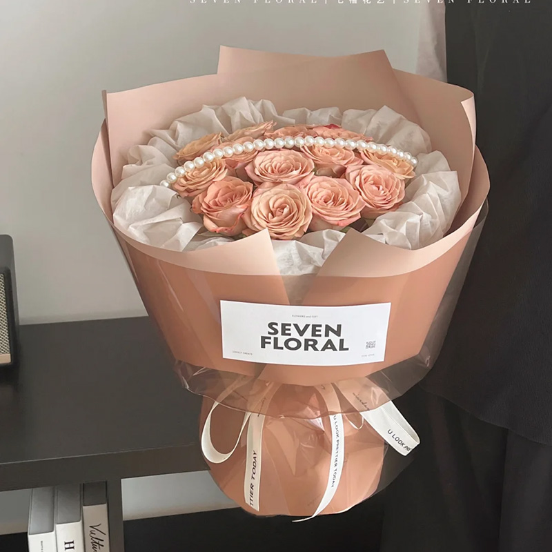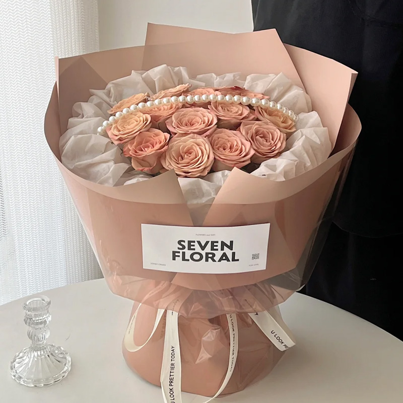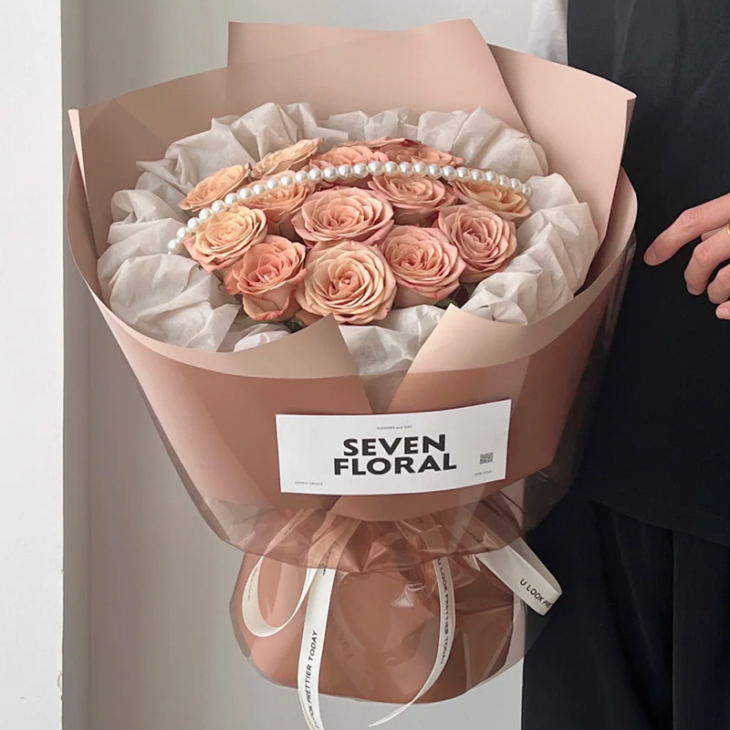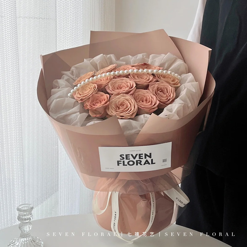 - 花材精选13枝卡布奇诺玫瑰,1条珠串,白色纸内衬,同色系小香风包装。