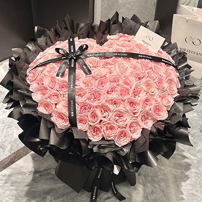 - 花材精选红玫瑰、香槟玫瑰共99枝,香槟玫瑰中间围成I♡U的图案,外围满天星丰满环绕。