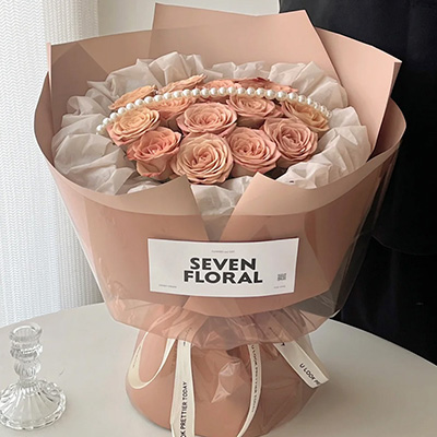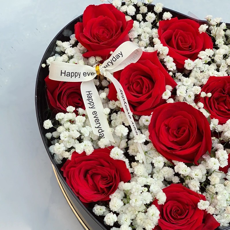 - 花材11朵红玫瑰,1个蝴蝶结装饰花面,满天星丰满间插。