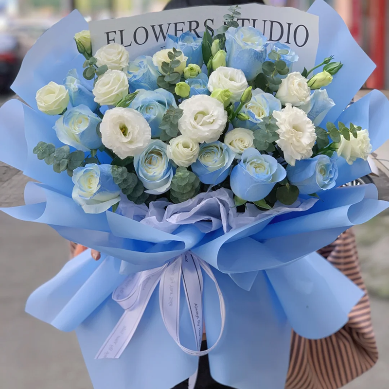 - 晚风告白 - 15枝碎冰蓝玫瑰,5枝多头白桔梗,尤加利叶间插点缀。