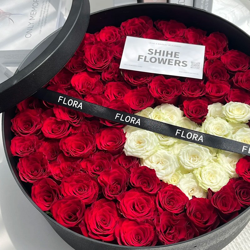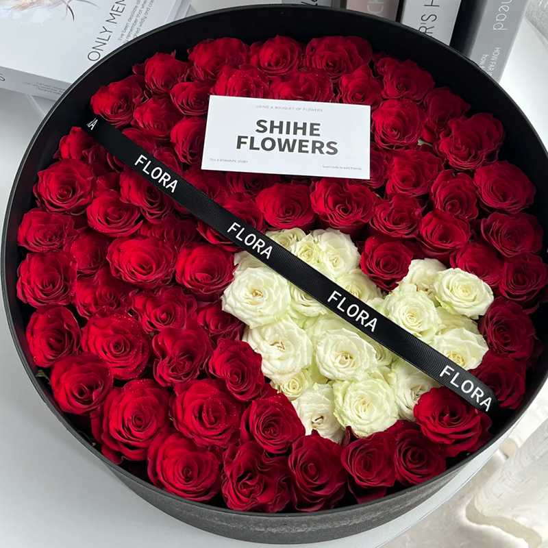 - 花材精选60枝红玫瑰,15枝白玫瑰(白玫瑰心形造型),一条缎带装饰花面。