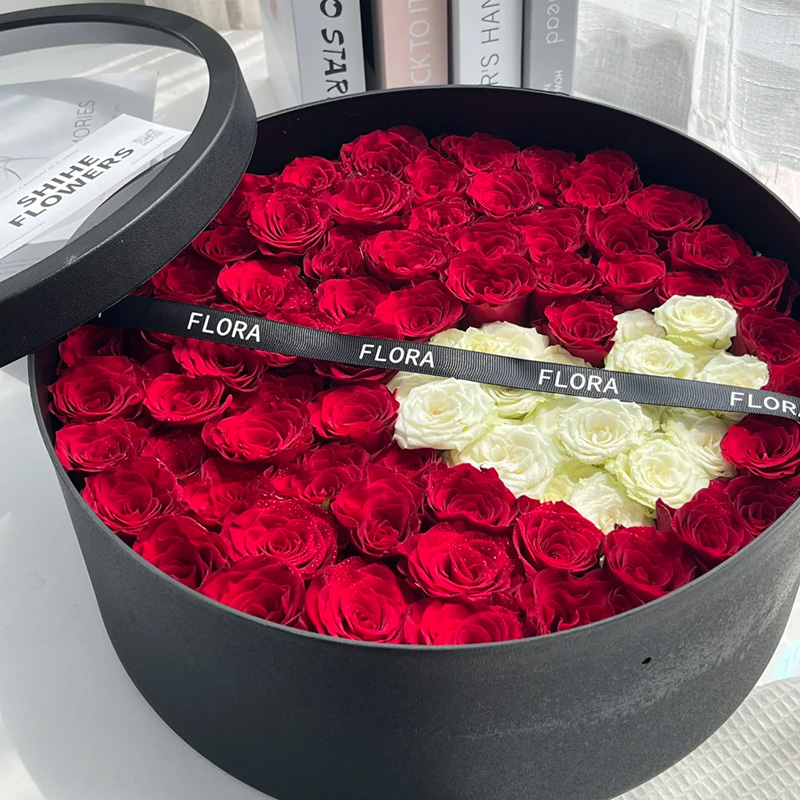 - 倾心爱一世 - 精选60枝红玫瑰,15枝白玫瑰(白玫瑰心形造型),一条缎带装饰花面。