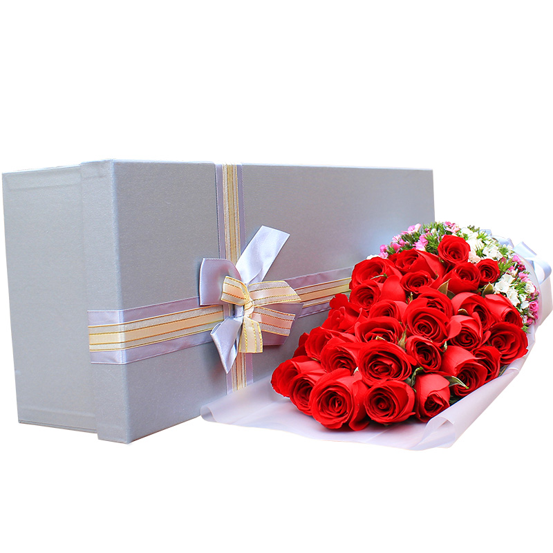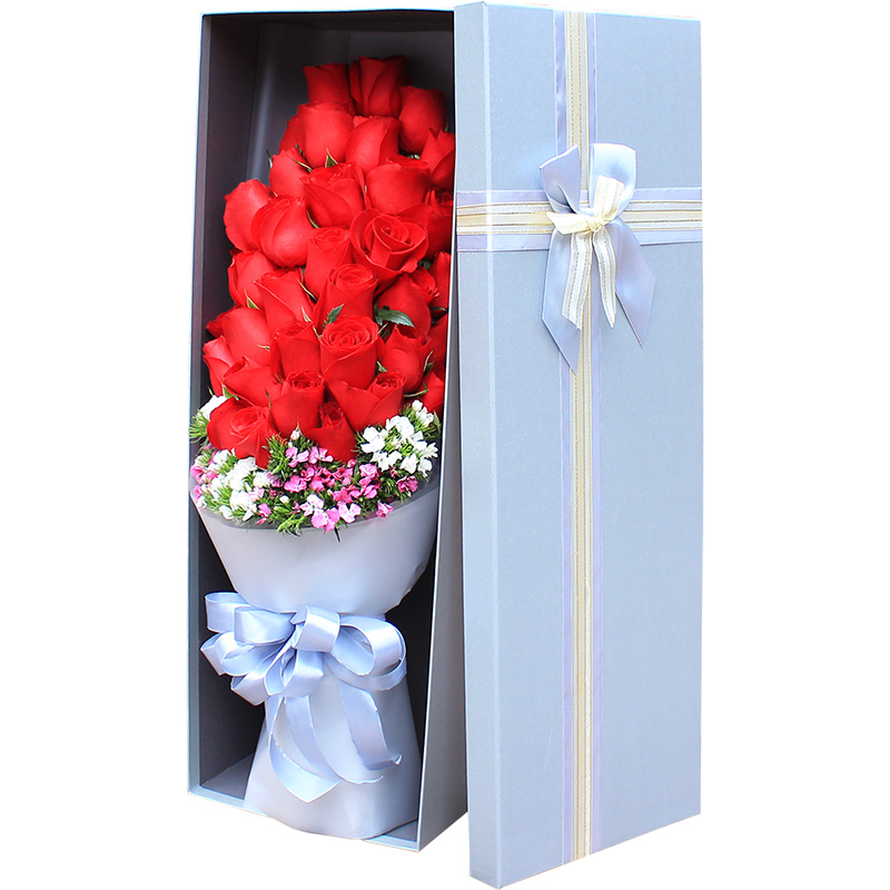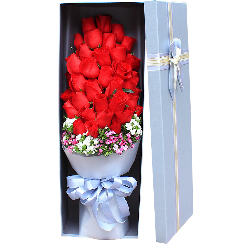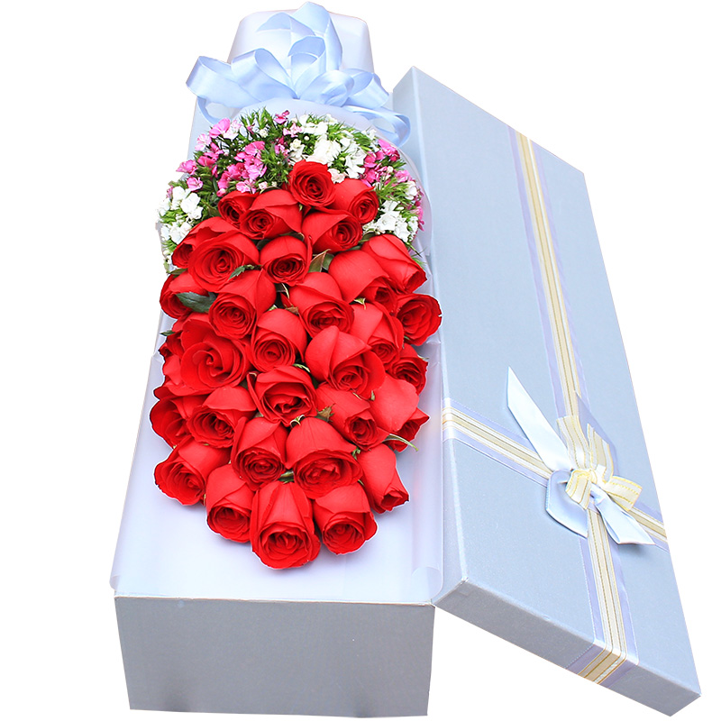 - 花材33枝红玫瑰,搭配石竹梅装饰。